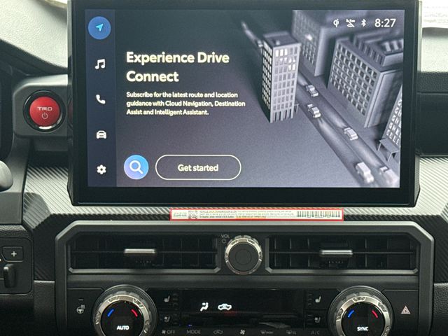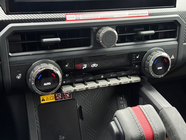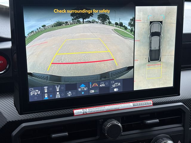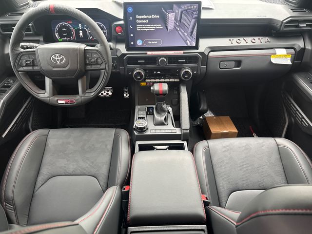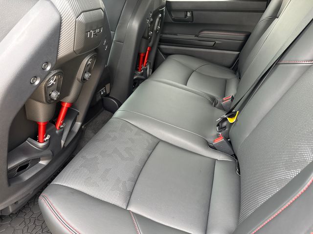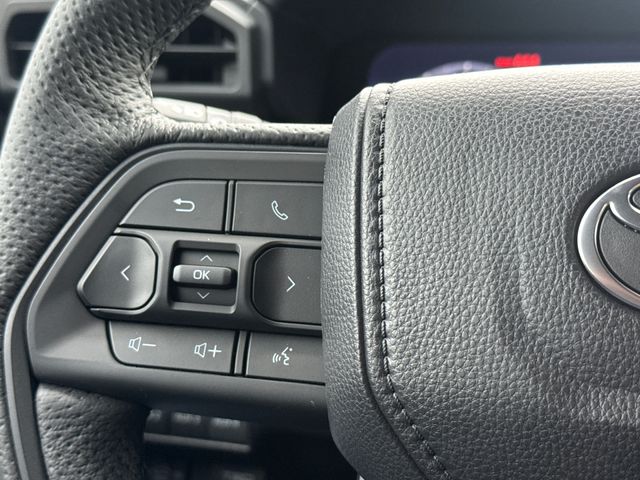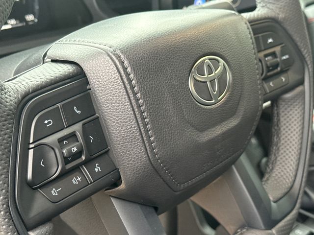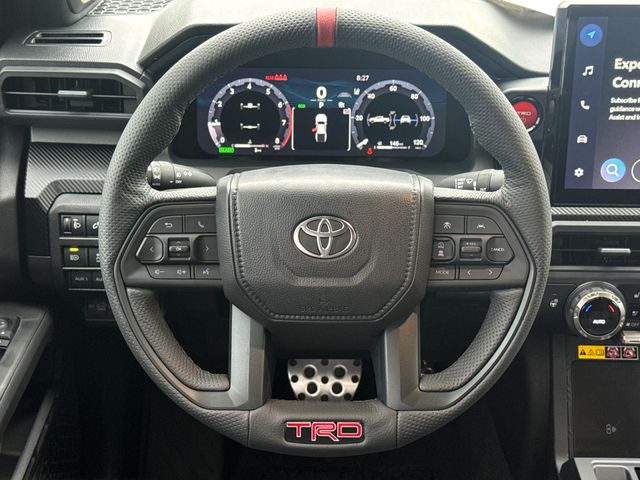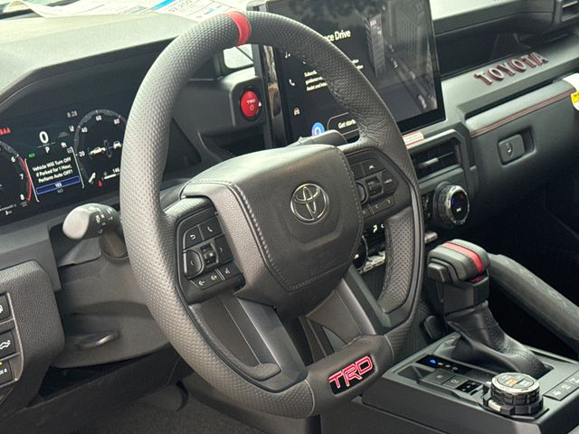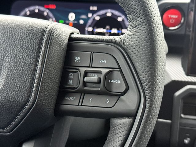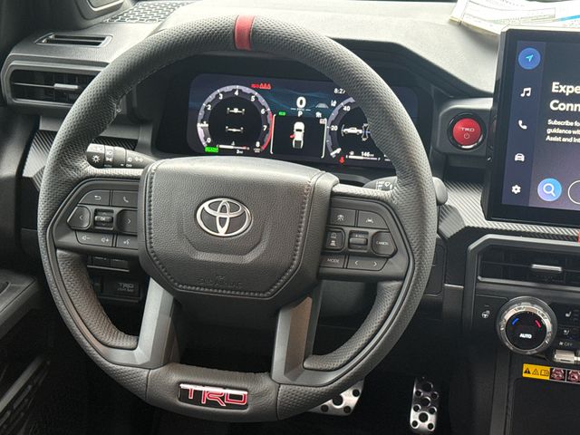 - TRD Pro leather-trimmed manual tilt/telescopic steering wheel with TRD badge, red center stripe, and phone, audio, display/infotainment, and Driver Assist controls